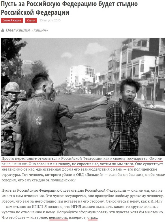 Кашин, используя гениальную аргументацию «государство – это менты» (то есть вы рождаетесь и проживаете жизнь вне государства, и только злобные менты напоминают вам о нем), призывает своих читателей отказаться от государства и... продолжать при этом жить в этом же государстве. Если бы он закончил призывом к эмиграции, то здесь была бы какая-то логика. Но призвать отказаться от чувства ответственности за свое государство, и начать ненавидеть и бояться его одновременно. Это: