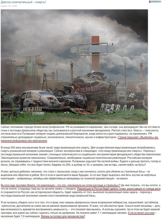 Кунгуров, известный как говорящий на языке подзаборного бандеровца блогер, чьи тексты рекомендует Стрелков, в начале поста хоронит Победу и Родину на свалке (см. картинку), а в конце утверждает, что Россия «подыхает» и что «революцию в России будет делать тупая, агрессивная от голода вата». И все это ради того, что организовать «переход к постиндустриальной экономике знаний и восстановление индустриальной базы». Безумие этого бреда уже так велико, что все-таки лучше бы Кунгуров заменил свою безразмерную графоманию на короткую цитату Навального: «Бараны! Еб*ный в рот!». Так он емче передал бы свой основной посыл и как-то умнее бы выглядел.