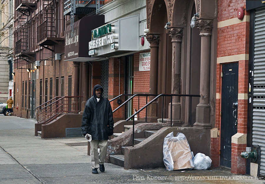 Быть интернационалистом в Гарлеме нашему человеку трудно. По вечерам, чтобы избежать пробок на манхэттенской кольцевой, мне часто приходилось проезжать через его северные кварталы. Самая контрастная картинка в памяти — полураздетая белая проститутка, прислонившаяся на холодном ветру к опоре метрополитена, в районе, где на километр вокруг ни одного белого лица. Ни одного. Дружба народов.