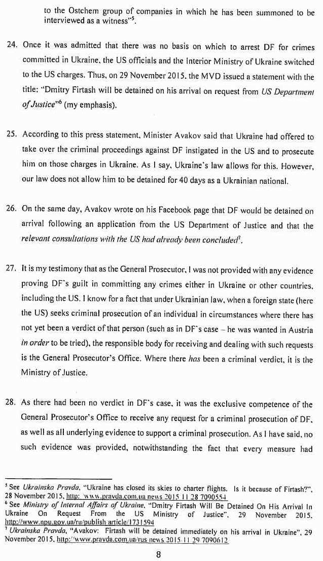 При отсутствии достаточных доказательств он был бы либо оправдан, либо уголовное производство было бы прекращено. Следовательно, все обвинения против него были бы сняты. Однако вместо этого государственные чиновники из администрации президента США, которые имели существенное влияние на всю правоохранительную систему Украины (мое собственное увольнение является свидетельством такого влияния — см. ниже), не предприняли никаких действий в отношении возбуждения уголовного дела против Д. Ф. в Украине. Следовательно я считаю, что после того, как они осознали, что в Украине существует устойчивое судебное преследование, и после их недавней потери, что касается дела об экстрадиции в Австрию, то они предприняли активные шаги для того, чтобы заблокировать его возвращение в Украину.