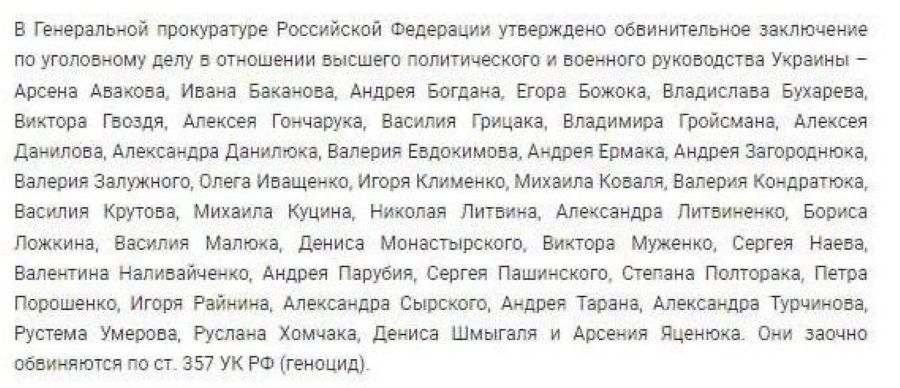 Генпрокуратура РФ направила в суд ДНР дело о геноциде, в котором Москва обвиняет украинские власти времен Порошенко и Зеленского (нынешнего президента Украины, или как любят говорить в России - "главы киевского режима" в этом списке нет).