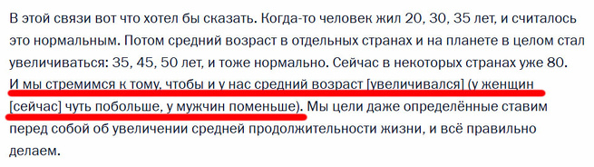 Как я писал ранее, Главный начальник позавчера немало озадачил странными заявлениями о своих устремлениях:Кстати, я вижу, что текст подредактировали ибо вчера всё выглядело так:Они звучат особенно странно в свете происходящих последние несколько лет событий, вызвавших еще большое уменьшение продолжительности жизни российских мужчин из-за роста смертности в в...