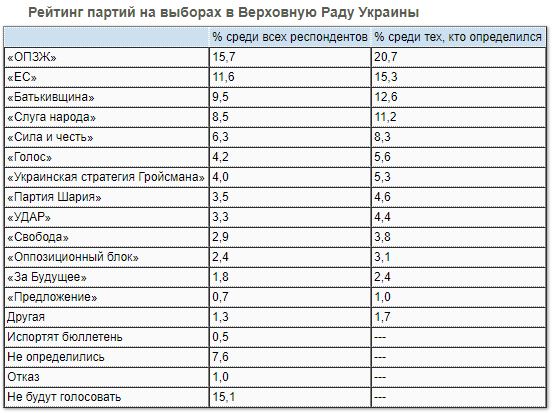 "Оппозиционная платформа — За жизнь" очень серьёзно укрепила свои позиции, после выборов в парламент нарастив рейтинг 13,05% до 20,7%. Серьёзно добавили "Европейская солидарностью" 15,3% против 8,1% и Батьковщина 12,6% против 8,18% полтора года назад. Фактически симпатии "Слуги народа" растеклись к её оппонентам.