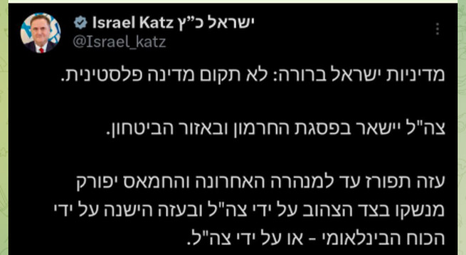 Министр обороны Израиля Кац заявил, что палестинцам не стоит надеяться на создание собственного государства.«Политика Израиля ясна: палестинское государство не будет создано.ЦАХА...