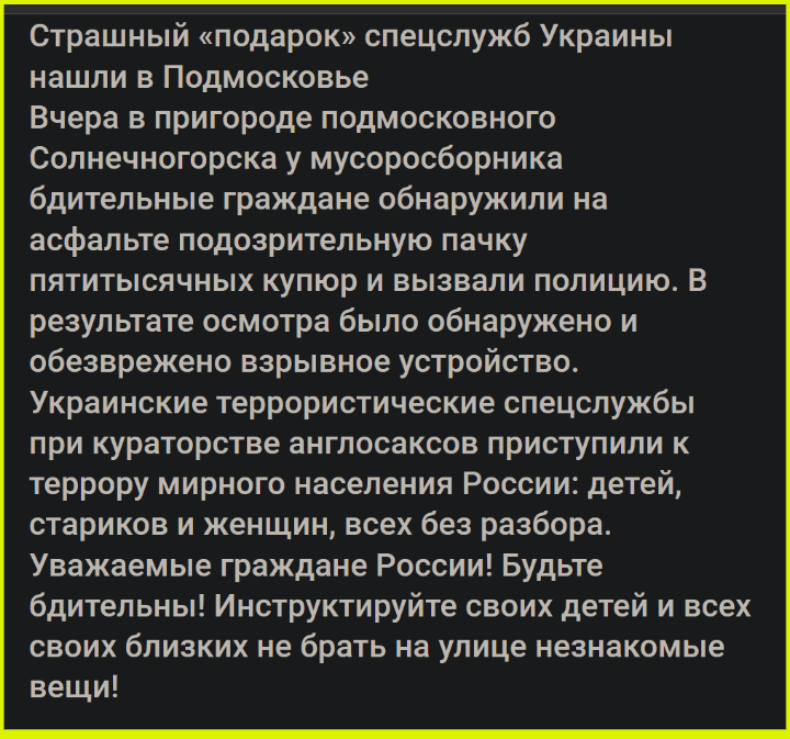 У нас тут гранату нашли, обмотанную в купюру. Аккурат около школы. Спасибо бдительным гражданам - никто не пострадал -