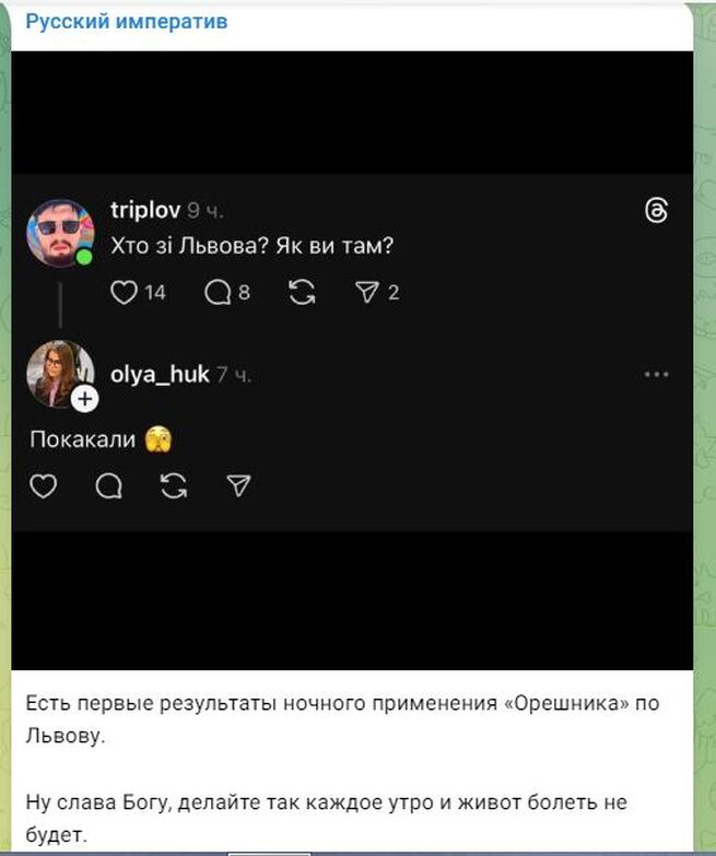 Очевидно, Россия в течение года смогла собрать одну единицу готовой продукции в виде БРСД “Орешник”, что в некотором смысле соответствует темпам сборки МБР “Сармат” – 1-2 ракеты в год. И применить её только с одной целью - в истеричном припадке запугать Украину и Запад своей вундервафлей.*****Украина очень оперативно отреагировала на ночн...