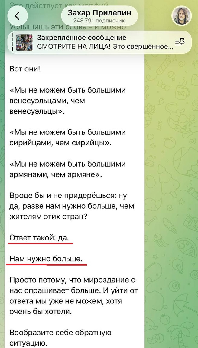 Нам, это кому, Прилепин?С них, блин, спрашивает некое "Мироздание", а мы отвечать должны.Хватит уже нести хрень про "Вселенские Миссии".Если с тебя спрашивает "Мироздание", обратись к психиатру.Есть интересы России, есть отсутствие интересов России.И есть противоречия интересам России.А про "Мироздание" роман напиши.Хотя после Стругацких и тут тебе дела...