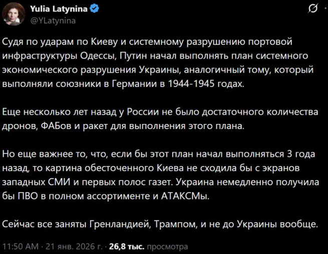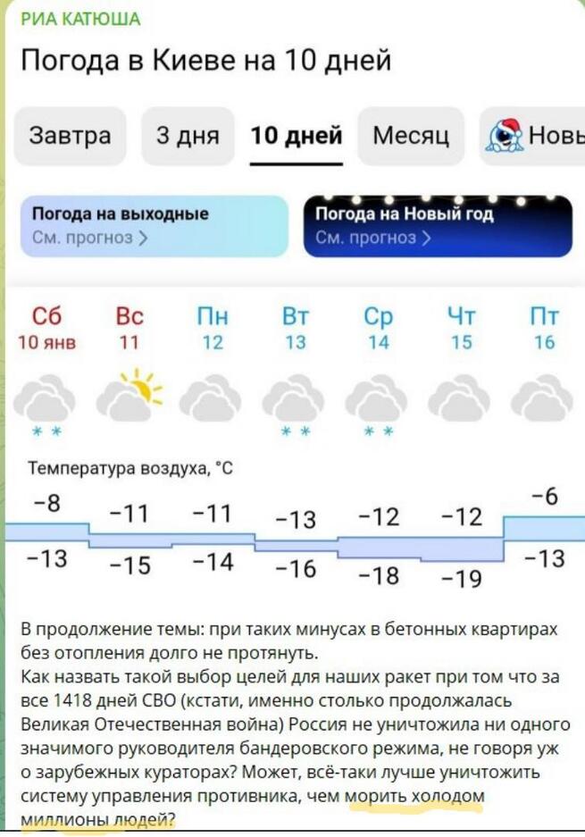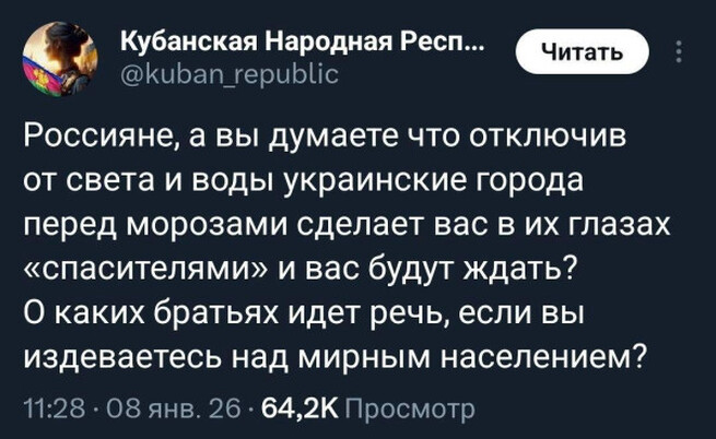 В российской элите нет «партии мира». Есть коалиция «спасателей Украины», а есть партия «уничтожителей Украины». Наблюдая за сообщениями о блэкаутах и отключениях тепла при минус 20 по Цельсию в украинских городах, ваш покорный вспоминает (с удовлетворением) один свой давний и радикально немейнстримный тезис. Вы его уже читали на страницах этого ка...