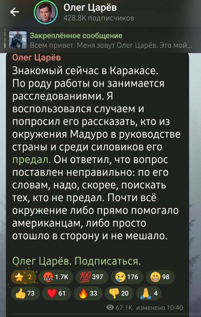 Уровень допуска знакомого директора крымского санатория к конфиденциальной информации относительно высших эшелонов власти иностранного государства просто поражаетДаже ко многому привыкшего лампового кота.Кстати, попадись вот этот вот глумёж над сказками Царёва на глаза шизам из его паствы, они бы прочли это так: "А, так вы отрицаете, что в Венесуэле был...