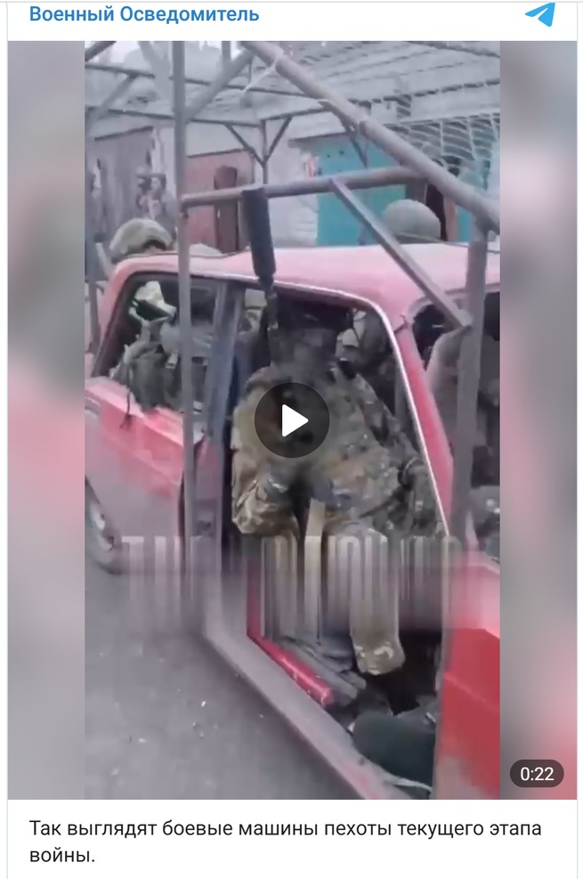 У т. Христозопулоса вышла статья. Там на видева бойцы СВО гоняют вместо БМП на жигулях.Немедленно перевозбудилось сообщество местных ,,патриотов". Легко и ненапрягаясь они доказали на пальцах, что БМП и БТР гораздо хуже жигулей на поле боя.