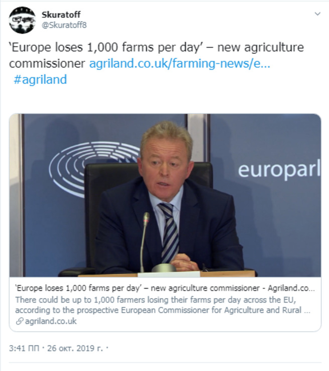 Новый комиссар ЕС по сельскому хозяйству публично заявил, что Европа теряет 1000 ферм в день.