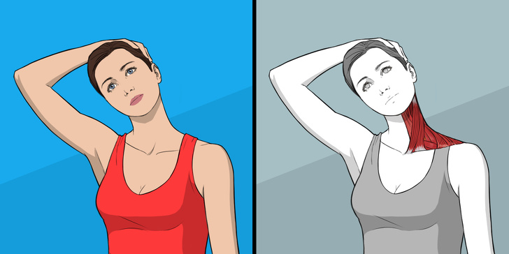 Повторите упражнение, наклоняя голову влево. Для достижения лучшего эффекта придерживайте затылок правой и левой руками соответственно.