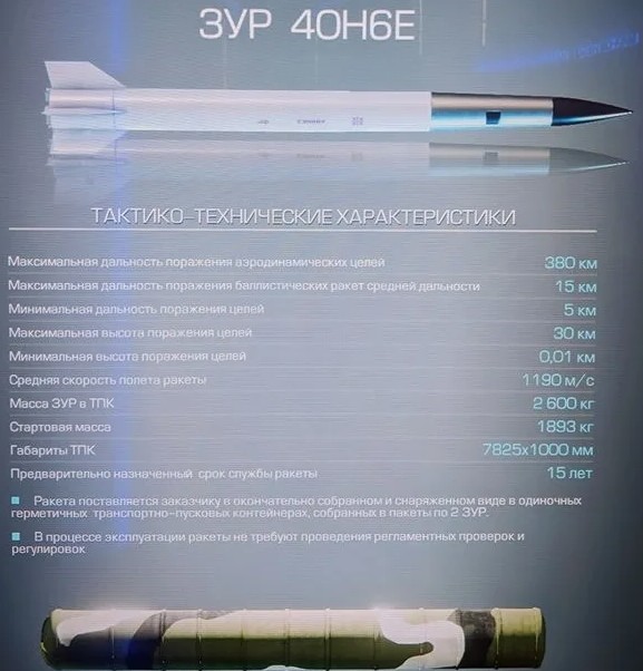 "Уникальная траектория ракеты 40Н6, поднимающаяся на экстремальные высоты перед снижением к цели, обеспечивает С-400 непревзойдённые возможности для ударов за горизонтом и позволяет нейтрализовать цели на пределах дальности до 5 метров над землёй. Это даёт подразделениям С-400 возможность наводить удары по самолётам с низким профилем полёта и крылатым ракеты на больших дистанциях".