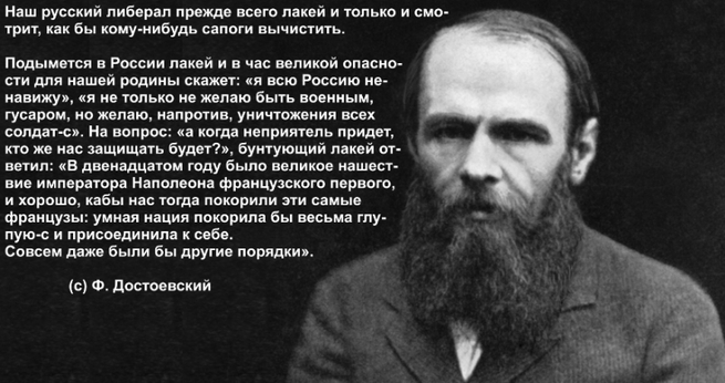 «никогда наш либерал не в состоянии позволить иметь кому-нибудь свое особое убеждение и не ответить тотчас же своему оппоненту ругательством или даже чем-нибудь хуже… Либерализм не есть грех; это необходимая составная часть всего целого, которое без него распадется или замертвеет; либерализм имеет такое же право существовать, как и самый благонравный консерватизм; но я на русский либерализм нападаю, и опять-таки повторяю, что за то, собственно, и нападаю на него, что русский либерал не есть русский либерал, а есть не русский либерал… русский либерализм не есть нападение на существующие порядки вещей, а есть нападение на самую сущность наших вещей, на самые вещи, а не на один только порядок, не на русские порядки, а на самую Россию. Мой либерал дошел до того, что отрицает самую Россию, то есть ненавидит и бьет свою мать. Каждый несчастный и неудачный русский факт возбуждает в нем смех и чуть не восторг. Он ненавидит народные обычаи, русскую историю, всё. Если есть для него оправдание, так разве в том, что он не понимает, что делает, и свою ненависть к России принимает за самый плодотворный либерализм… Эту ненависть к России, ещё не так давно, иные либералы наши принимали чуть не за истинную любовь к отечеству и хвалились тем, что видят лучше других, в чем она должна состоять; но теперь уже стали откровеннее и даже слова «любовь к отечеству» стали стыдиться, даже понятие изгнали и устранили, как вредное и ничтожное… Такого не может быть либерала нигде, который бы самое отечество свое ненавидел. Чем же это всё объяснить у нас? Тем самым, что и прежде, — тем, что русский либерал есть покамест ещё не русский либерал; больше ничем, по-моему» (Фёдор Михайлович Достоевский, роман «Идиот»).