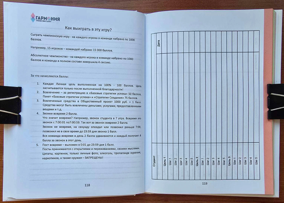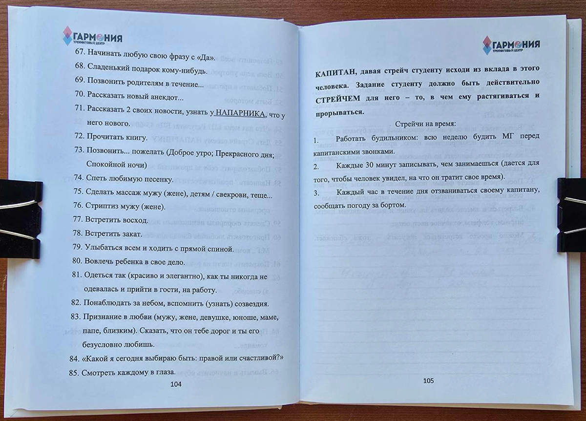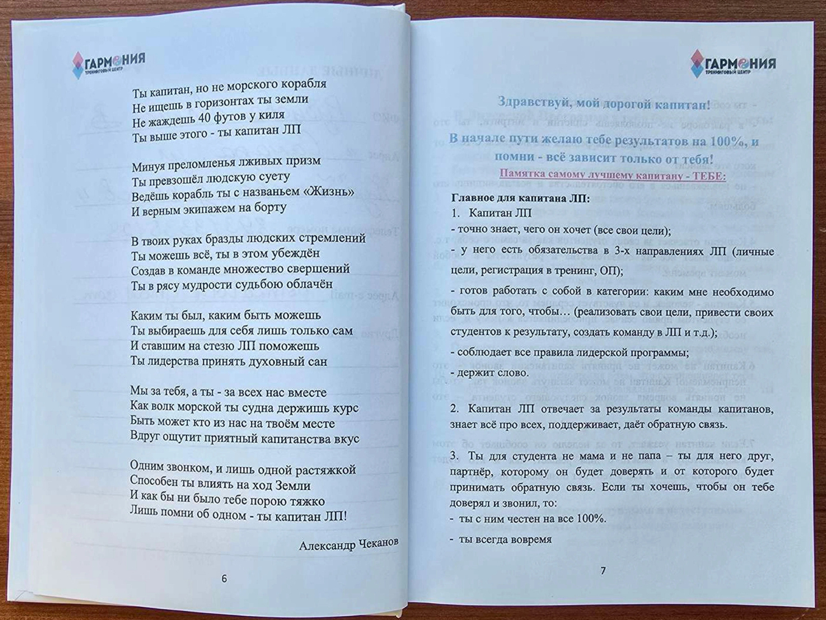 В распоряжении редакции 63.RU оказался внутренний документ скандального тренинг-центра «Гармония». Это «Книга капитана» — 245-страничное руководство для кураторов, управлявших участниками. Кандидат психологических наук, эксперт по культам Александр Невеев, изучив документ, заявляет: перед нами — инструкция по созданию управляемого сообщества, члены которого, по версии потерпевших, бесплатно работали на обогащение его создателей.