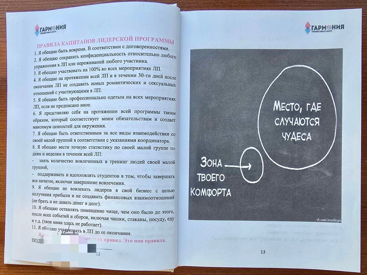 Сейчас физическое пространство «Гармонии» пустует — центр выселили. Но десяткам людей ее система, как они уверяют, оставила многомиллионные долги, семейные проблемы и психологические травмы. «Книга капитана» — это документ, который, по заключению эксперта, имеет все признаки руководства не для личностного роста, а для построения тоталитарного контроля.
