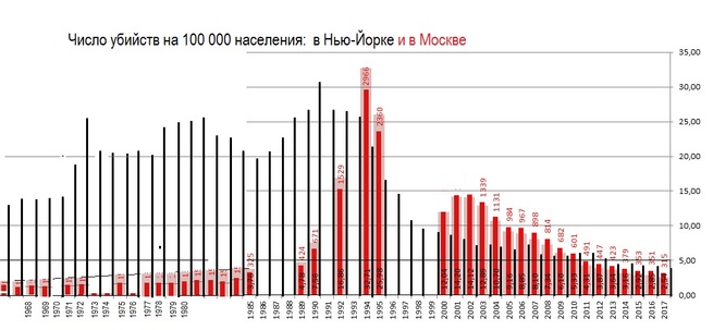 Гниение флор и фаун одного поста, под названием "Детям о СССР", подтолкнуло меня к сравнению преступности по двум городам, Москве и Нью-Йорку. Собрал общедоступные сведения, привёл их к общему знаменателю - числу убийств на 100 000 населения - и разместил на имеющемся в сети рисунке, расширив временную шкалу и добавив цифры по Москве и Нью-Йорку.