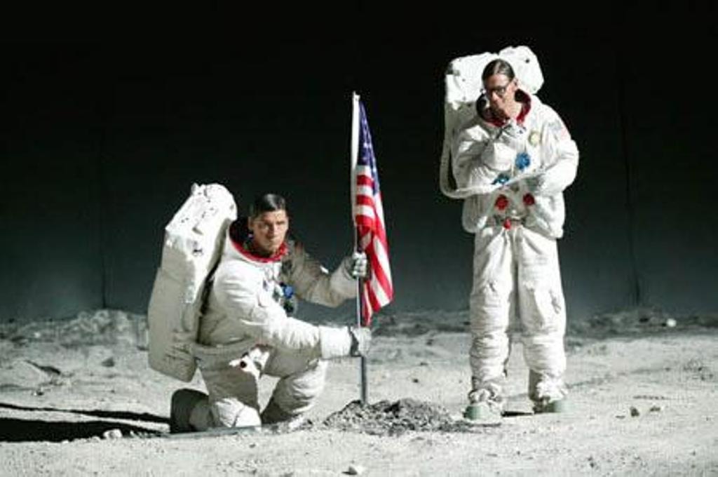 - каким таким техническим образом первая "прямая трансляция в режиме реального времени с Луны" началась со снятого в Голливуде сюжета?