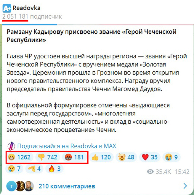 Любопытные выводы можно сделать, глянув на этот пост в мессенджере «Телеграм». Интернет-издание Readovka имеет больше двух миллионов российских подписчиков. И вот как реагирует люди на новость о том, что глава Чечни наградил себя званием героя этой республики.Три первых смайлика без слов, но красноречиво выражают эмоции читателей.