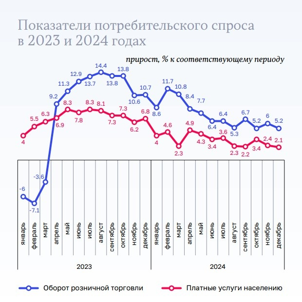Этот самый потребительский спрос в России находится в устойчивом тренде на падение с середины 2023 года, то есть, падает уже примерно 2 года.
