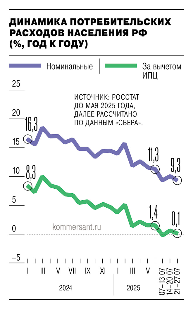 Причем обратите внимание: показатель рассчитывается с поправкой на официальную инфляцию Росстата (то есть, сейчас 9%). А потребительский спрос показывает инфляция потребительских товаров - товаров повседневного спроса, которая гораздо выше (в лучшем случае - в 1,5-2 раза). Такую инфляцию, если помните, рассчитывал аналитический холдинг Ромир, и он тоже (о чудо!) внезапно перестал публиковать данные с сентября 2024 года. И на последний момент публикации эта потребительская инфляция составляла около 22%.