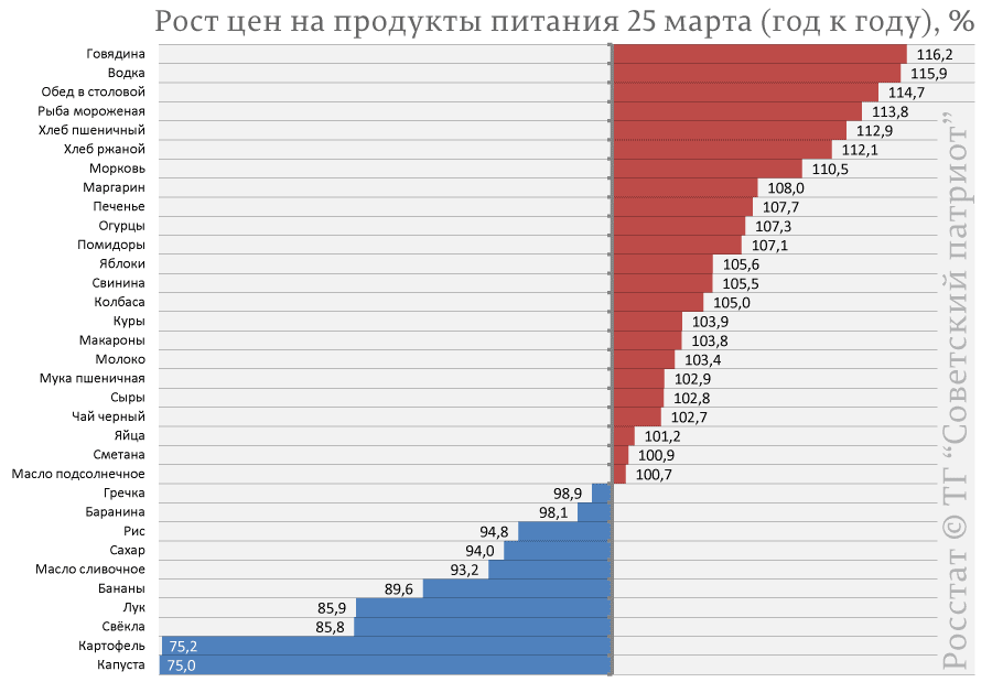 Есть такое выражение, что бухать дешевле, чем нормально есть. Но прежде чем поговорим об этом, я хочу показать, как ведут себя цены на продукты питания в годовом интервале, т.е. насколько они выросли (или упали) относительно конца марта прошлого 2025 года.