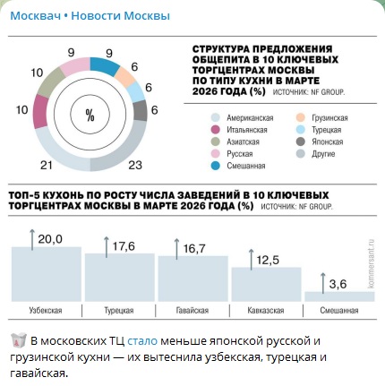 Исследователи проанализировали десять ключевых торговых центров столицы и пришли к неутешительному выводу. К марту 2026 года количество ресторанов русской кухни сократилось на 6,3%. Теперь их 30 штук. Также упало число ресторанов японской кухни. За год их стало на 9,1% меньше и сейчас насчитывается 20 штук. Коснулась данная тенденция и ресторанов с грузинской кухней. Их число упало на 4,8% и сейчас составляет 20 штук.