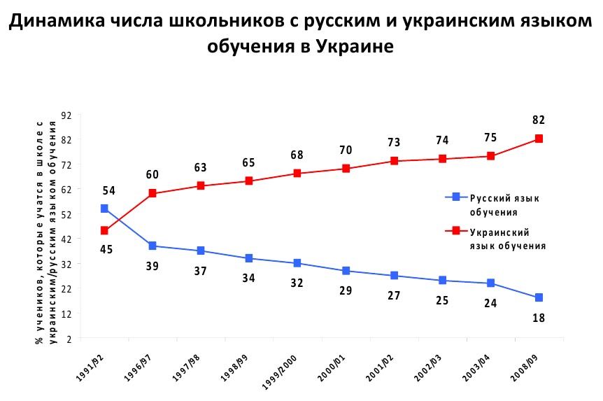 Налицо был результат политического решения о сокращении количества школ с русским языком преподаваний. Ведь после «взрыва национального сознания» начала 90-х языковая ситуация на Украине, наоборот, возвращалась в своё естественное состояние (вплоть до следующего – «оранжевого» – всплеска).
