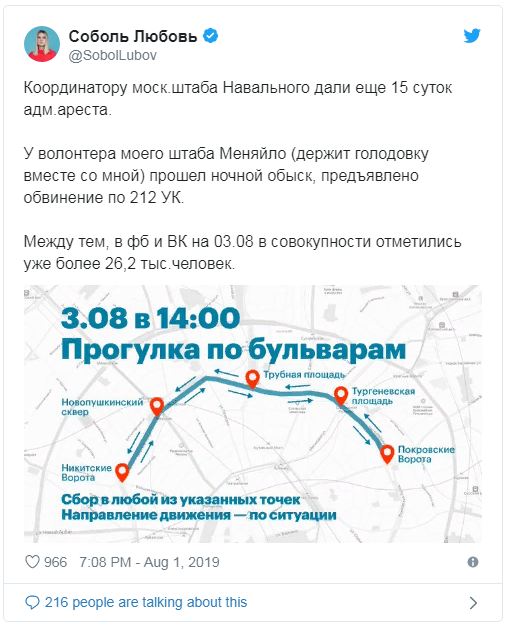 Перед акцией 3 августа она отмечала у себя в твиттере, что по оценкам ФБК на данную акцию соберется более 26 тысяч человек. По факту прямых трансляций корреспонденты «Дождя», «Медузы», «МБХ» тихонько обходили количество протестующих, рассказывая о плохой погоде, характере мероприятия (прогулка по Бульварному кольцу, а не митинг) и о том, что подсчитать количество участников будет сложно.