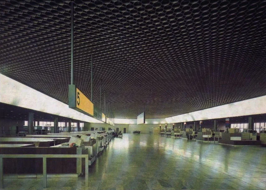 Зайдя в терминал со стороны второго этажа, вы попадаете в зал вылета. Сейчас многое в здании сохранилось с тех пор. Обратите внимание, как мало тогда было в здании пассажиров.