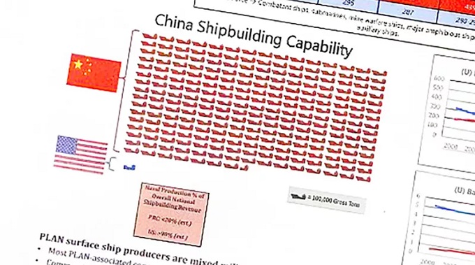 Согласно слайду, который Управление военно-морской разведки США подготовило для закрытого брифинга, в настоящий момент Пекин имеет возможность строить 232 военных корабля на одно судно, спущенное на воду под звездно-полосатым флагом.