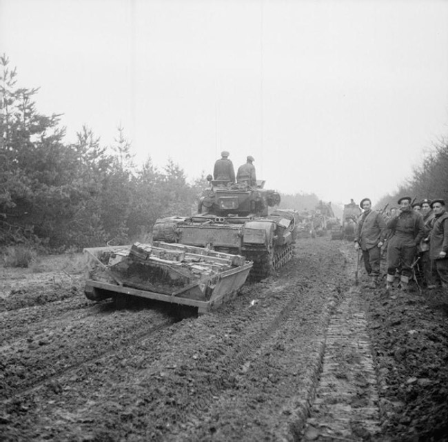Танки «Черчилль» 34-й танковой бригады тянут сани с боеприпасами в начале операции «Веритебл», 8 февраля 1945 г.