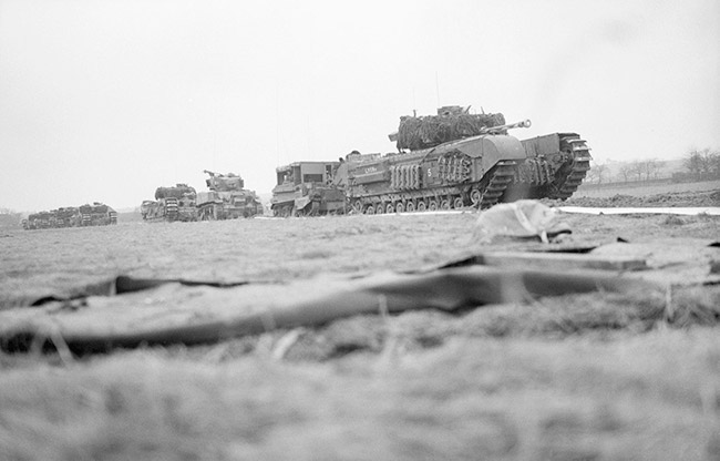 Колонна танков «Черчилль» и другой техники в начале операции «Веритебл», Северо-Западная Европа, 8 февраля 1945 г.