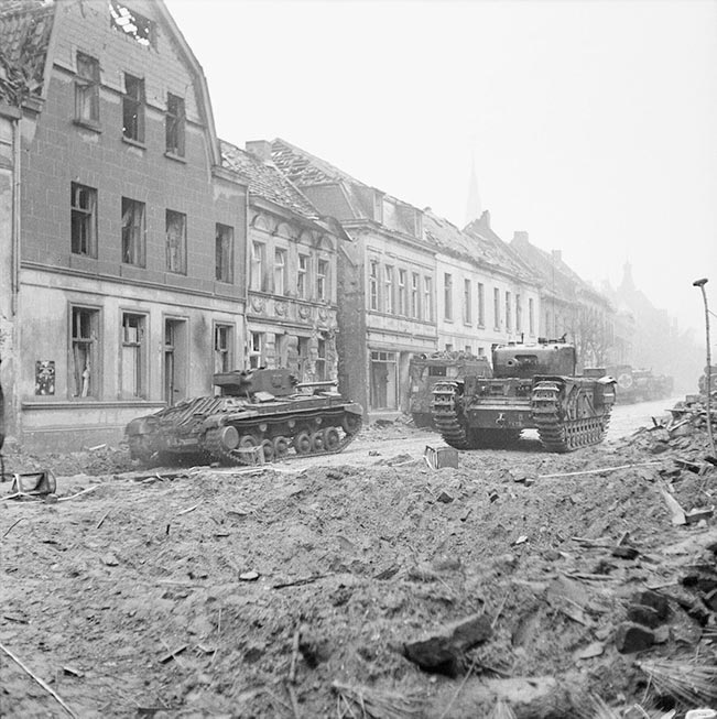 Танк «Черчилль» и танк «Валентайн» Mk XI Королевской артиллерии (слева) в Гохе, 21 февраля 1945 г.