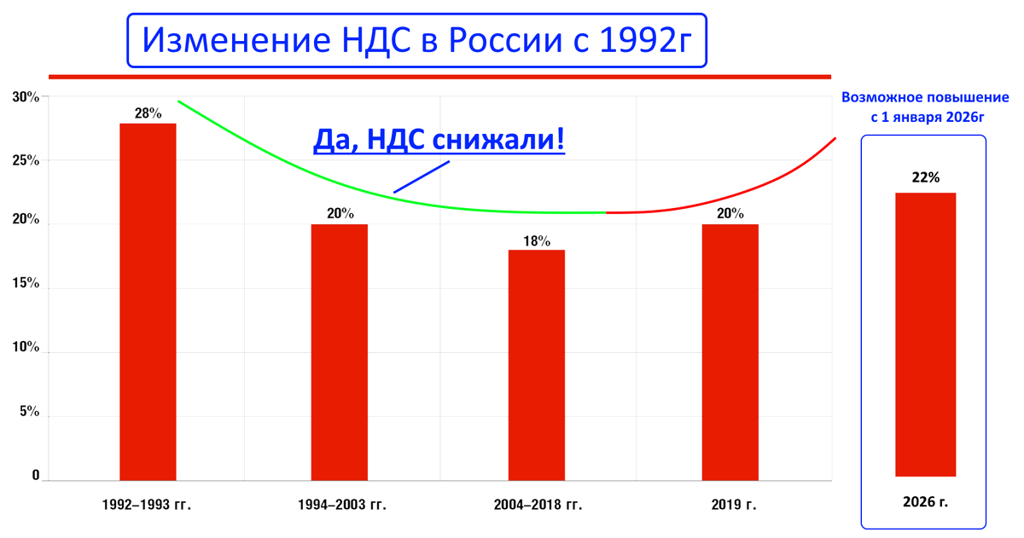 С 1 января 2026 года НДС в России поднимется с 20 до 22%.