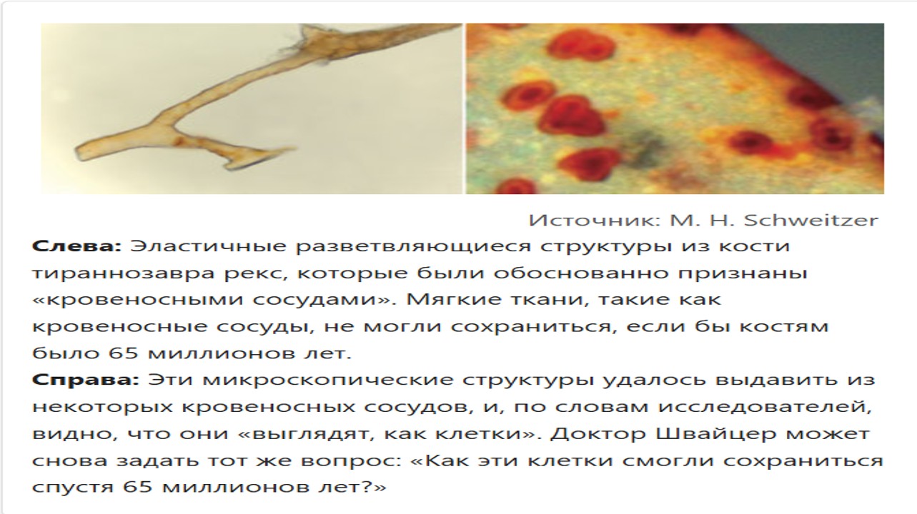В кости динозавра были найдены микроскопические красные кровяные клетки, а также гемоглобина, подтверждённого иммунологическими тестами (см. Сенсационное обнаружение крови динозавра! и Ответ критику).