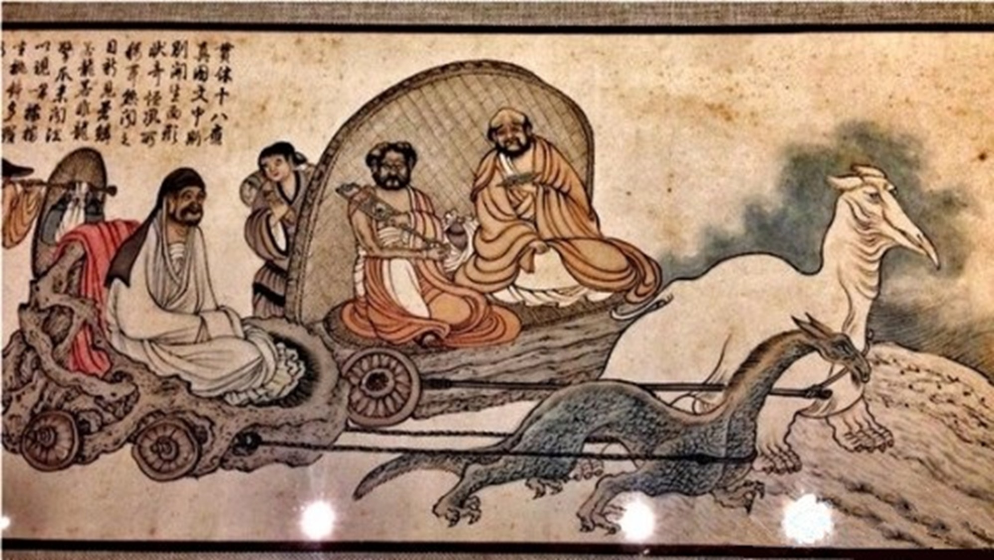 Динозавры Китая (Чиная) Книга Zuozhuan рассказывает повествование о том, как древние люди выращивали драконов и как государство использовало услуги двух кланов, известных как« Дракон »и« Укротители драконов ». (Sterckx, R.,  The Animal and the Daemon in Early China,  2012 , стр. 52.) Исторические записи рассказывают о династии Сун (960-1279 гг.) Император, который воскресил драконов в своем дворцовом комплексе. (Niermann, LD «Динозавры и драконы», «  Создание ex Nihilo Technical Journal 8: 1, 1994, стр. 85-104.) Династия Мин Китайский пейзажист Ву Бинь (1573-1620) некоторое время служил секретарем императора. Среди его картин - кусок под названием «Восемнадцать архатов», показывающие, как китайские драконы тянут телеги левое фото.