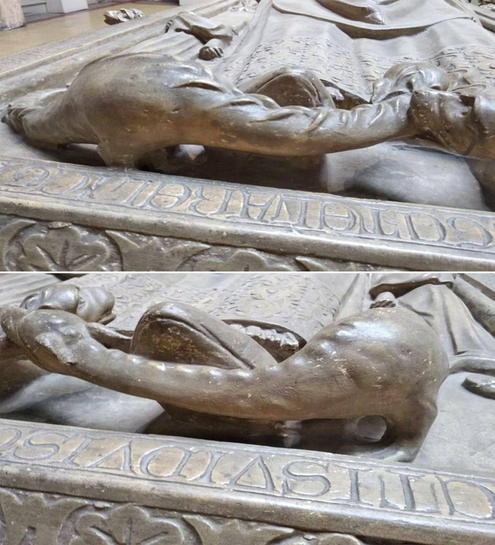 Надгробие епископа. После 1222 г. хранилось в Нотр-Дам д’Амьен, Франция. Автор неизвестен. Надгробие XIII века, а в ногах - животные, напоминающие динозавров. Но какие могли быть динозавры в XIII веке, если о них стало известно только в 1824 году? Их тогда, кстати, называли "допотопными животными". Нотр-Дам д'Амьен — это самый большой по размерам готический собор Франции, расположенный в городе Амьен.