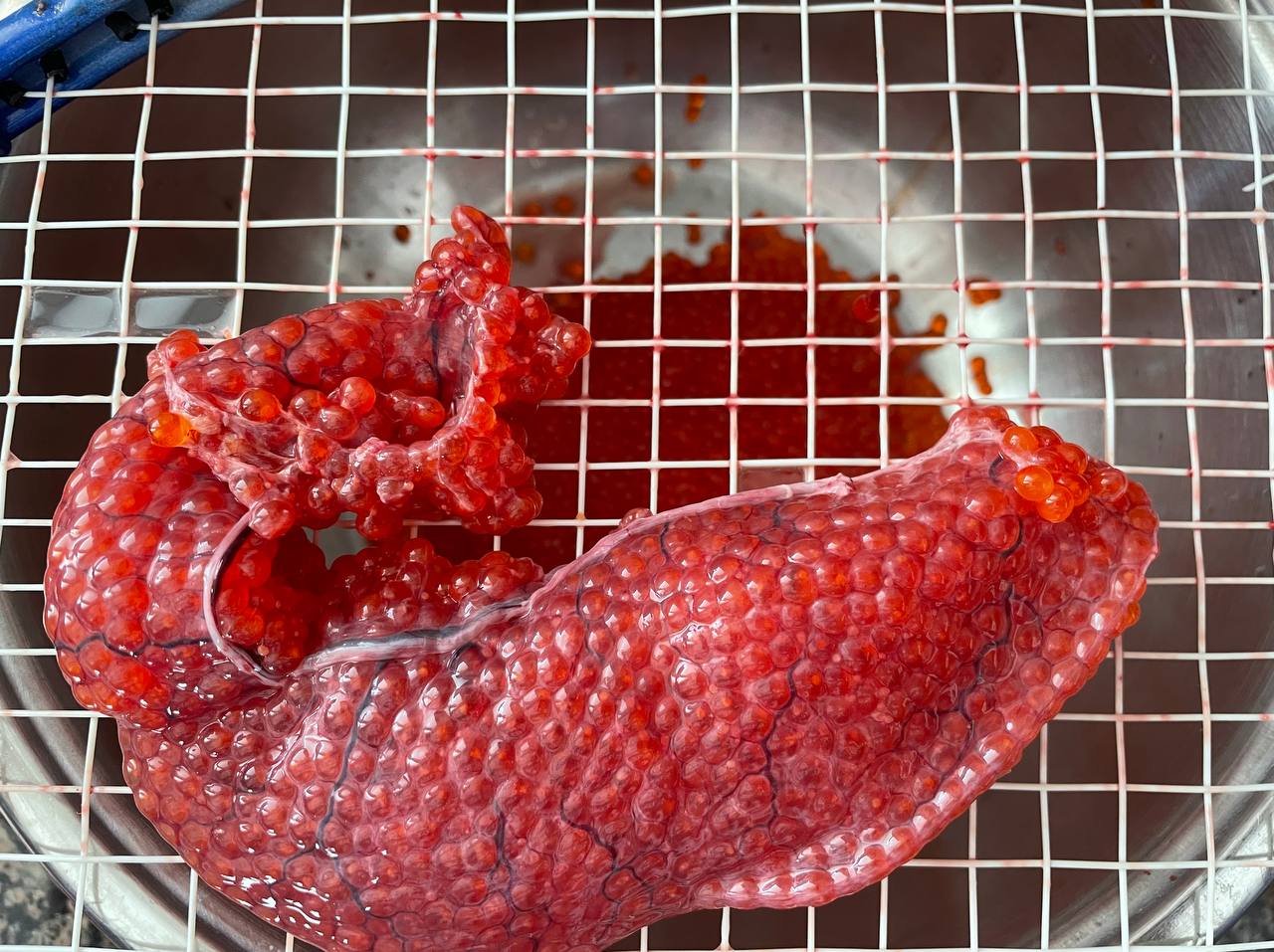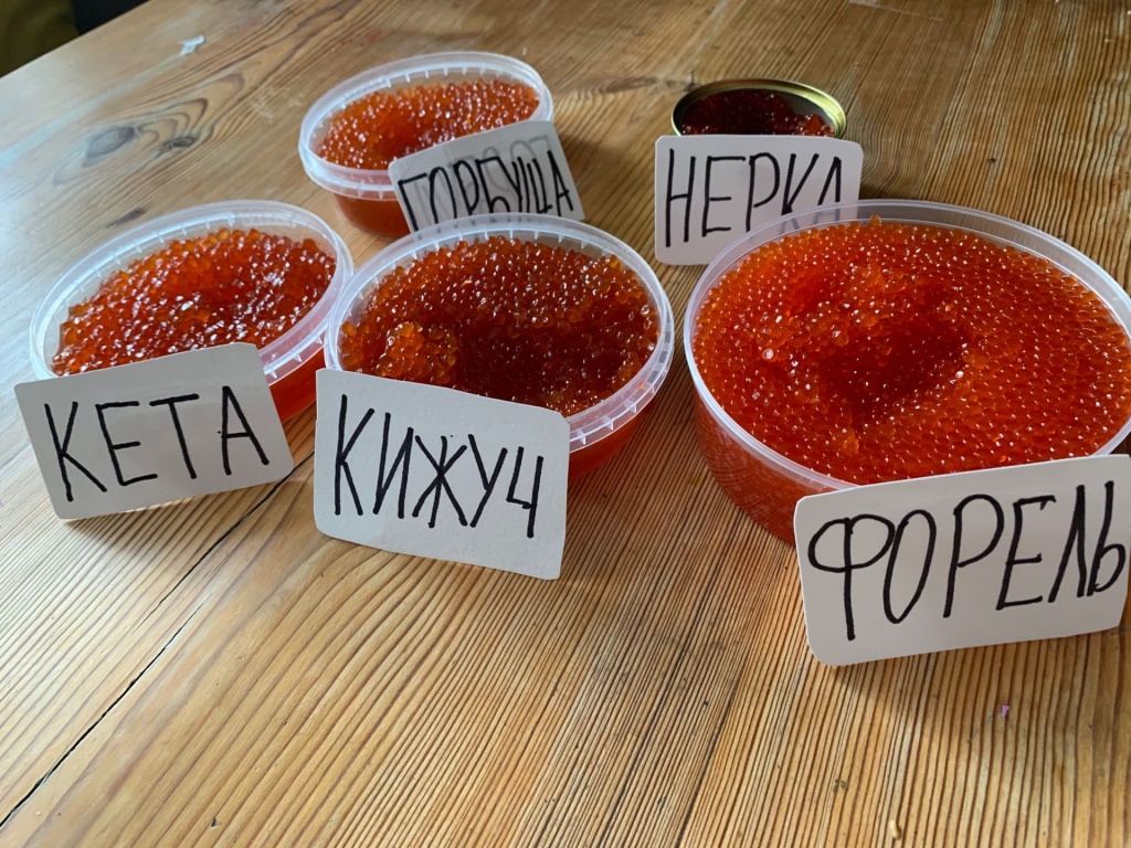 Красная икра горбуши. Этот вид икры известен своим бледно-оранжевым или темно-красным цветом и икринками от мелких до средних размеров. Зерна икры горбуши среднего размера 3-5 мм. По сравнению с другими видами красной икры чаще всего бывает на наших праздничных столах. Вкус богатый, насыщенный. Считается универсальной красной икрой, которая понравится всем. Особенности нереста горбуши: Однократный нерест: Горбуша нерестится всего один раз в жизни. Продолжительность жизни: Цикл жизни составляет два года. Сезонность: Нерест происходит с июля по октябрь, в зависимости от региона. ( Икра только дикого вылова) Основными компонентами пищи горбуши являются ракообразные (криль), головоногие и крылоногие моллюски, а также молодь рыб.