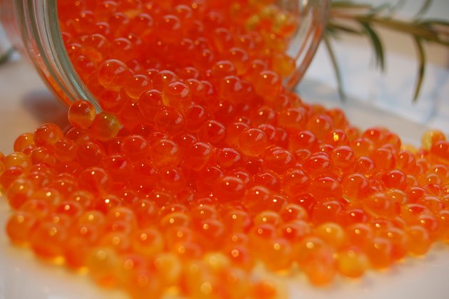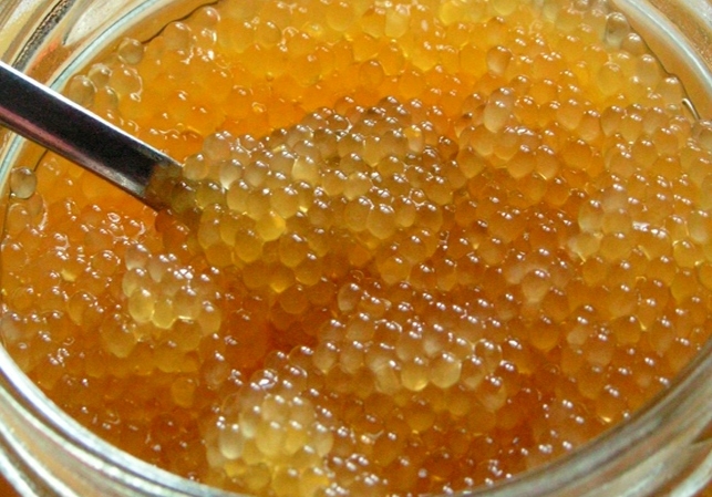 Имитация икры. Натуральные рыбные деликатесы имитируют с помощью белков, желатина, морской растительности. Он стоит намного дешевле. Существует множество рецептур, технологий изготовления, сырья различных видов. Самыми полезными считаются имитации, в основе которых используются рыбий жир и водоросли. Жировые икринки внешне и по вкусу похожи на настоящие. Единственное их отличие – на гладкой поверхности не остается влажности после их долгого лежания. Продукция, изготовленная из водорослей, имеет довольно специфический вкус и желтоватые оттенки разной насыщенности. Плотные шарики раскусываются мягко, без хлопка.