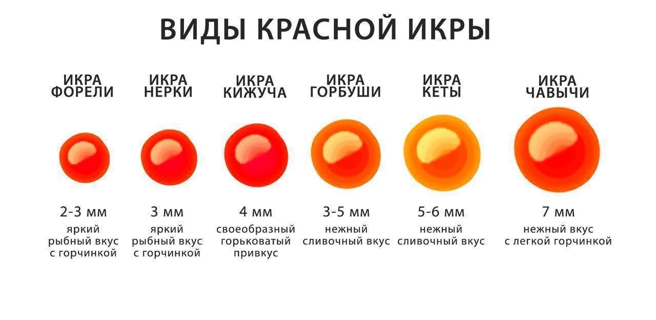 Красная икра – продукт нереста рыб, принадлежащих к семейству лососевых. Продукт разделяется на 6 видов, отличающихся размерами и цветом зерна, текстурой, вкусовыми качествами. Красная икра называется сокровищницей полезных веществ из-за богатства и разнообразия ее химического состава. Виды икры, их характеристики: 1-форели – солоноватая, желтая либо ярко-оранжевая, имеет плотную, упругую оболочку, липкая (2-3 мм диаметром); 2-нерки – с легкой горчинкой послевкусия, темно- или ярко-красная, с мягким покрытием ядра; 3-кижуча – с пикантной, ярко выраженной горечью, бордовая, рекордсмен по содержанию витамина D; 4-горбуши – сладковато-соленая, светло-оранжевая или оранжевая, с тонкой кожицей; 5-чавычи – горьковатая, слегка острая, насыщенно-красная; 6-кеты – идеально круглая, нежная, жирная, ароматная, янтарно-оранжевая с красноватым отливом.