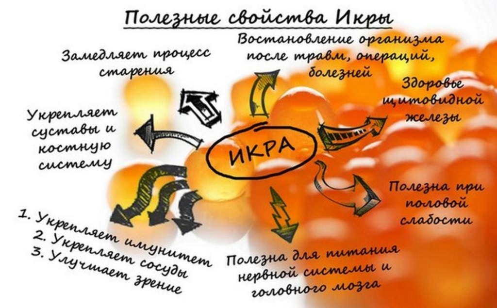 Икра лососевая польза: Красная икра нормализует метаболизм, благотворно влияет на зрение и общее состояние организма. Она богата полиненасыщенными омега-3 жирными кислотами. Это настоящий источник молодости и красоты. Компоненты, содержащиеся в икре лососевых, укрепляют кости и нормализуют кровообращение. Лецитин способствует нейтрализации вредного для здоровья холестерина. Треть содержания икры – легкоусвояемый белок, и всего лишь 15% – жиры. Она даёт мощный заряд энергии без риска набрать лишние килограммы. Включение в рацион красной икры помогает естественным образом поднять уровень гемоглобина в крови. Научно доказано, что такое вещество, как лизин, в составе красной икры, препятствует возникновению онкологии. Большое разнообразие витаминов повышает иммунитет, сводя к минимуму риск возникновения широкого спектра заболеваний. Натрий в составе икры оказывает сосудорасширяющее действие. Снижается риск образования тромбов и в целом нормализуется кровообращение. Регулярное употребление жирных омега-3 кислот, которыми богата икра, является профилактикой ожирения, депрессии, заболеваний сердца и сосудов, астмы и пр. Икра стимулирует репродуктивную функцию организма, особенно благотворно влияя на мужское здоровье.
