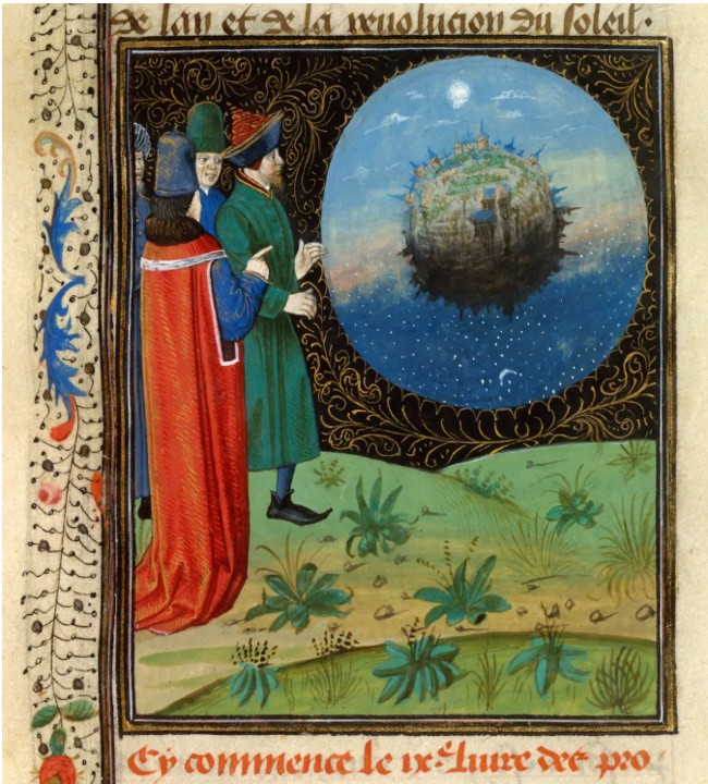 Изображение Земли из космоса 15-го века, из французского перевода «De proprietatibus rerum (О свойствах вещей)» Бартоломеуса Англика (Варфоломея Английского) (предоставлено Национальной библиотекой Франции) . «О свойствах вещей» — фламандский двухтомник, состоящий из двух манускриптов, созданных в Брюгге в 1482 году и содержащих французский перевод трактата (Книга была переведена на французский язык в 1382 году Жаном Корбешоном. Этот перевод был сделан для короля Франции Карла V; на листе 7 первого тома есть миниатюра, изображающая преподношение перевода королю правое фото.) «О свойствах вещей» (лат. De proprietatibus rerum) Бартоломея Английского.