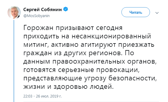 Об этом сообщил и мэр Москвы Сергей Собянин. Он рассказал, что по имеющимся у правоохранительных органов данным, готовятся действительно опасные провокации, которые могут угрожать жизни и здоровью людей.