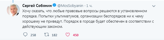 Вдобавок мэр Москвы ещё раз подчеркнул, что ультимативные методы – ни к чему не приведут и на пересмотр решения избиркома никак не повлияют. А порядок в городе будет регулироваться в соответствии с действующими законами РФ.