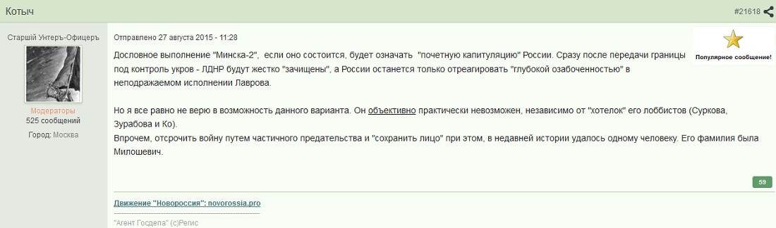 - неоказания прямой военной помощи ополчению со стороны России (речь идет о том, что если Россия не введет войска, то все пропало): «Если ВСУ начнут широкомасштабное наступление, Россия от прямой поддержки ВСН воздержится и они будут (практически неизбежно) разгромлены»;