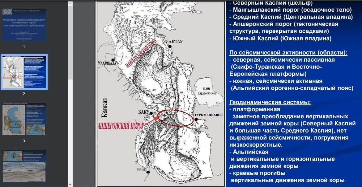 В 2012 году российский Институт океанологии РАН им. П.П. Ширшова опубликовал доклад «Инженерно-геологические опасности Апшеронского порога для транскаспийского трубопровода», в котором говорится, что на этом участке каспийского морского дна наблюдается «большое количество очагов микроземлетрясений, которые часто предваряют сильные землетрясения и крупные подвижки по разломам». Основной опасностью на Апшеронском пороге, пишут ученые, является моментальный разрыв трубопровода из-за непредсказуемых сейсмических катастроф.