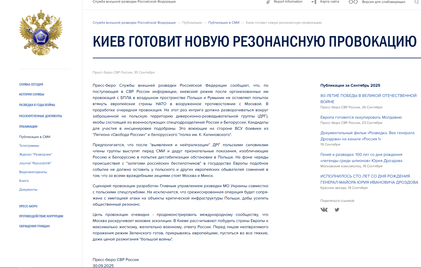 Пресс-бюро Службы внешней разведки Российской Федерации сообщает, что, по поступающей в СВР России информации, киевский режим после организованных им провокаций с БПЛА в воздушном пространстве Польши и Румынии не оставляет попыток втянуть европейские страны НАТО в вооруженное противостояние с Москвой. В проработке очередная провокация. На этот раз интрига должна разворачиваться вокруг заброшенной на польскую территорию диверсионно-разведывательной группы (ДРГ), якобы состоящей из военнослужащих спецподразделений России и Белоруссии. Кандидаты для участия в инсценировке подобраны. Это воюющие на стороне ВСУ боевики из "Легиона «Свобода России»" и белорусского "полка им. К. Калиновского".