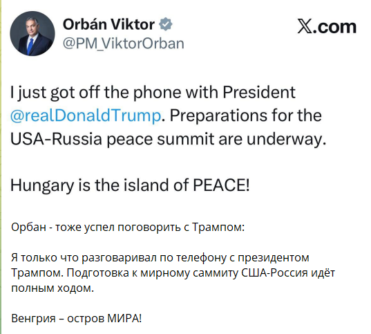 Премьер-министр Венгрии Виктор Орбан уже сообщил о готовности Будапешта принять саммит между Путиным и Трампом, назвав предстоящее событие великой новостью для сторонников мира во всем мире. Он немедленно позвонил Трампу, после разговора сообщил, что подготовка к саммиту Россия – США идет полным ходом, и даже назвал Венгрию «островком мира». Добавим, что на телефонную беседу Путина с Трампом позитивно отреагировал и российский рынок акций.