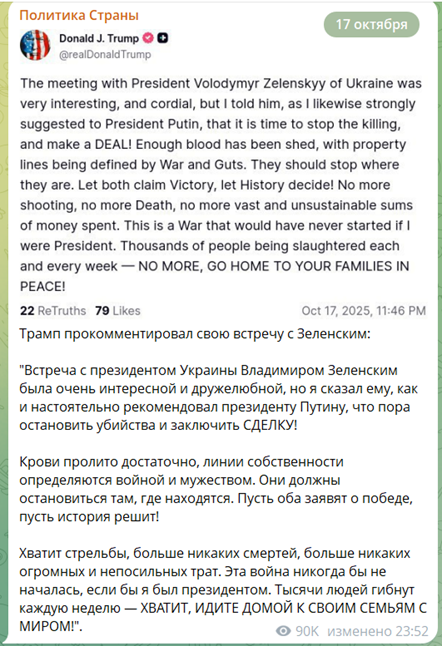 «Судя по действиям и заявлениям Трампа последних дней он все более склонен отстраняться от войны в Украины, а не вовлекаться в нее глубже, не желая, чтоб она становилась «войной Трампа». Особенно в ситуации, когда это вовлечение создает угрозу прямого столкновения Америки и РФ с риском ядерной войны (о вероятности которой, в случае передачи Томагавков Украине, намекали в Москве).
